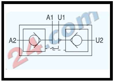 Durchflussrichtung von A1 > A2 + U1 > U2; gesperrt von A2 > A1 + U2 > U1