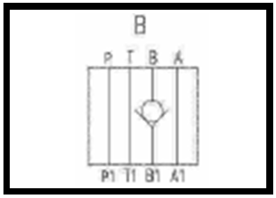 D = Kanal B; Durchflussrichtung von B > B1; gesperrt von B1 > B